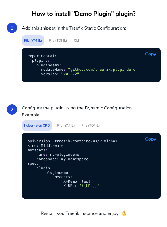 Selecting Install Plugin will display the necessary code to be added to the Traefik proxy's static and/or dynamic configurations to complete the installation process.